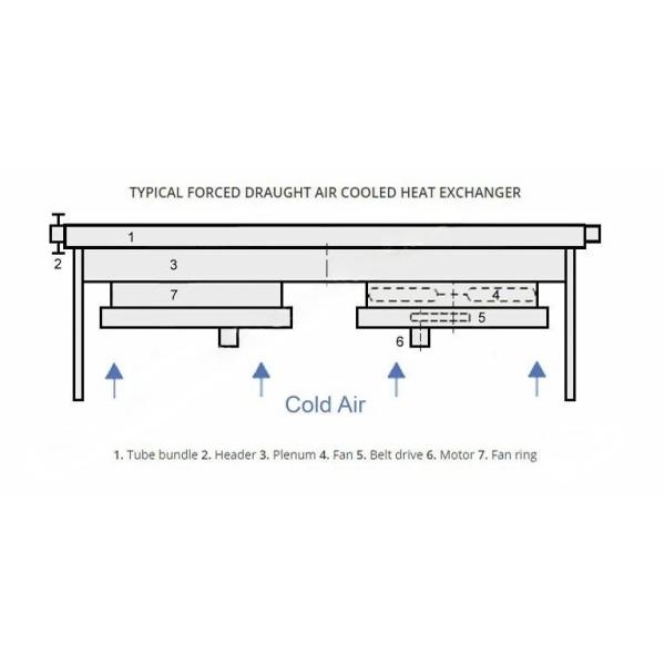 Typically, one set of finned tube air-cooled heat exchanger comprises a finned-tube bundle with rectangular box headers on both ends of the tubes. Circulating ambient air is provided as cooling medium by one or more motored fans. Usually, the air blows upwards through a horizontal tube bundle. The fans can be either forced or induced draft, depending on whether the air is pushed or pulled through the tube bundle. So we can also call an air cooler as “forced drafted air cooler” or “induced drafted air cooler”. The space between the fan(s) and the tube bundle is enclosed by a plenum chamber which directs the air. The whole assembly is usually mounted on legs or a pipe rack made of steel.